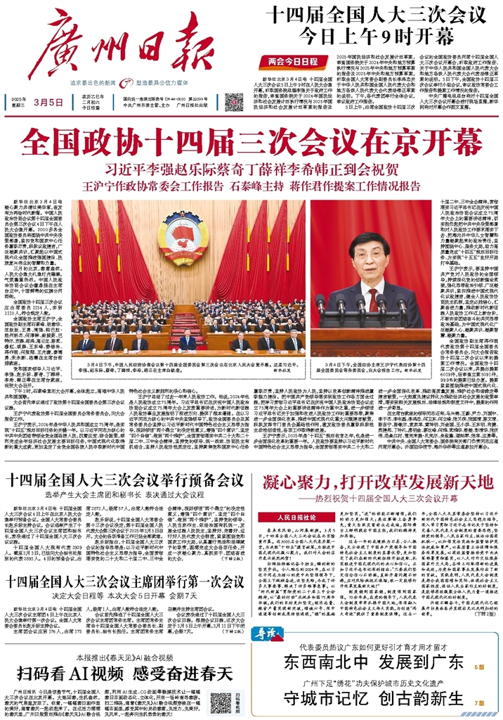 广州日报头版 A1十四届全国人大三次会议今日上午9时开幕 2025-03-05 2 2025年03月05日 星期三