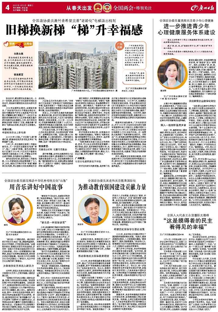 - “这是摸得着的民主看得见的幸福” 文/广州日报全媒体记者林琳 3月4日,十四届全国人大三次会议举行预备会议,全国人大代表吕世明作为广州日报特约记者,在北京人民大会堂对话了全国人大代表王永澄。 王永澄是十四届全国人大代