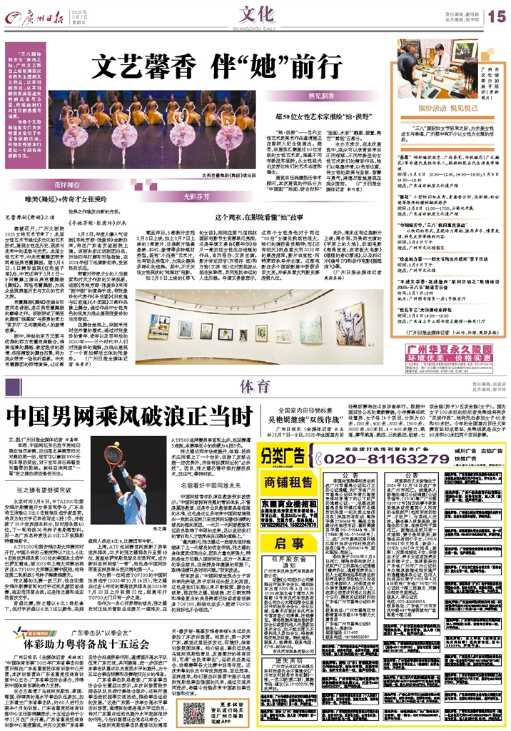 - 文艺馨香 伴“她”前行 “三八国际妇女节”来临之际,广州文艺舞台上纷纷涌现以女性为主题的文艺作品,以不同的形式、从不同的侧面展现出女性的风采与力量,传递出她们对生活的热爱与追求。 而各个文旅场馆也专门为女性量身定