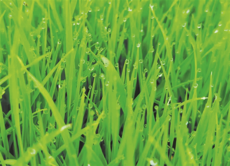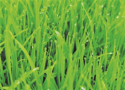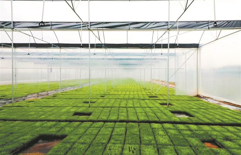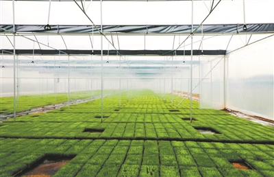 传统的露天育秧容易受雨水、气温等灾害性天气影响,导致秧苗质量不稳定,与之相比,大棚育秧优势明显,秧苗成活率高。同时大棚里配套了喷淋系统,能够有效地调节室内温湿度,喷洒更为均匀,这样也可以使秧苗生长更加整齐、健壮,为后续插秧工作打下良好基础。大棚里绿意盎然,一排排整齐的育秧盘映入眼帘,嫩绿的秧苗从盆中探出“脑袋”,整齐排列、长势喜人。