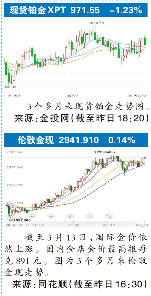 截至3月13日,国际现货铂金价格为971.55美元/盎司,国内销售市场的品牌足铂999价格最高达每克420元。以广州东山百货的PT950铂金首饰为例,截至3月13日,每克408元,相比一周前的价格涨约82元。全球多个机构表示看涨铂金,认为2025年至2026年将是铂金投资的黄金窗口。