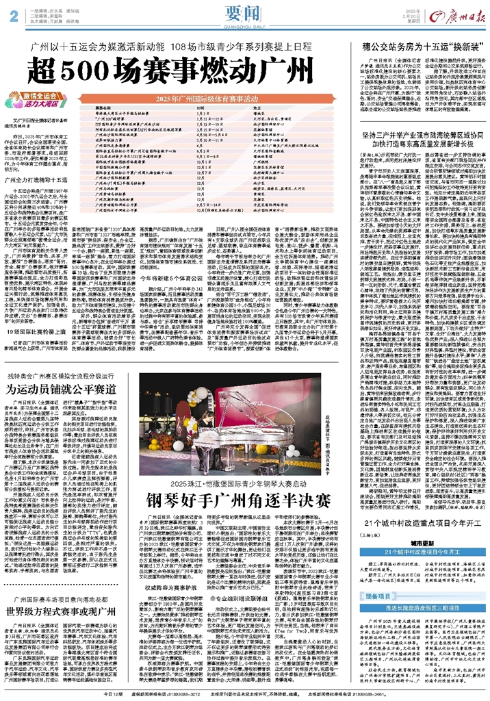 - 超500场赛事燃动广州 文/广州日报全媒体记者孙嘉晖 通讯员穗体宣 昨日,2025年广州市体育工作会议召开,会议全面落实全国、全省体育局长会议精神和广州市委、市政府部署要求,总结回顾2024年工作,研究部署202