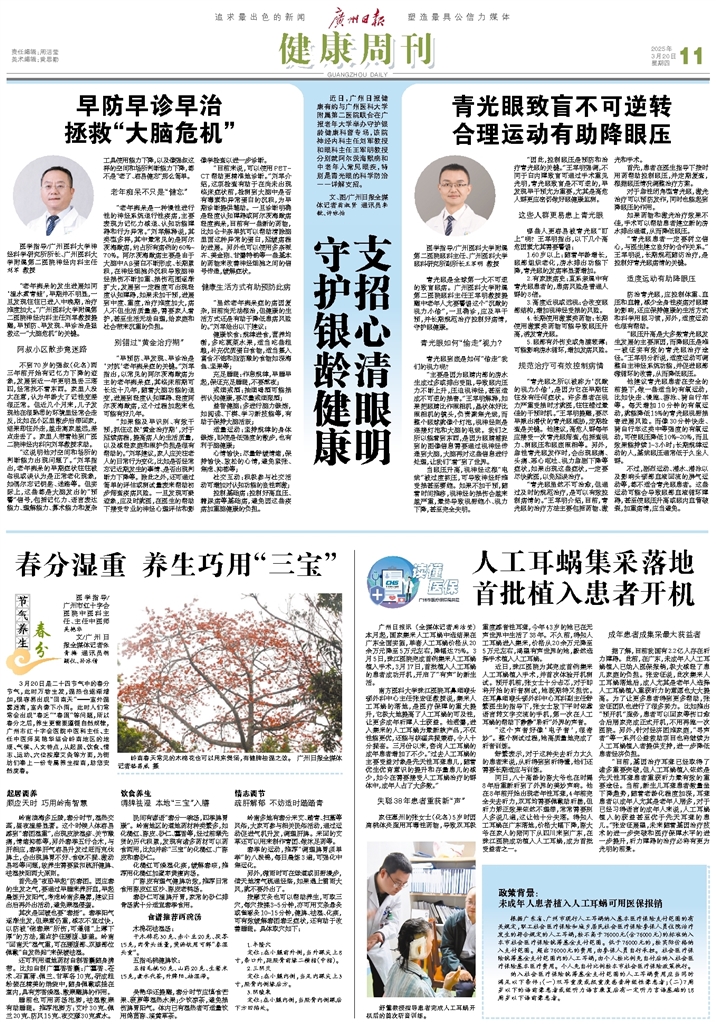 - 守护银龄健康 支招心清眼明 近日,广州日报健康有约与广州医科大学附属第二医院联合在广报老年大学举办守护银龄健康科普专场,该院神经内科主任刘军教授和眼科主任王军明教授分别就阿尔茨海默病和中老年人常见眼疾,特别是青光眼的科学防治