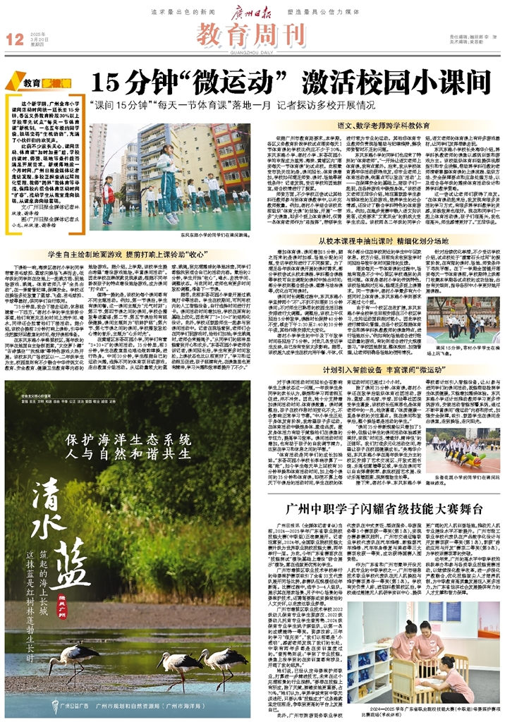 这个新学期,广州全市小学课间活动时间统一延长至15分钟,各区义务教育阶段30%以上学校率先试点“每天一节体育课”新机制。一名五年级的同学说,操场变得“生机勃勃”,充满了小伙伴们的欢笑声。