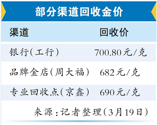 行业人士提醒,专门回收机构虽多,但价格不一,消费者一定要多比价。虽然银行门槛高,但是价格更优。3月19日,多家银行的黄金回购价都超过了700元/克,如工行品牌金回购价为700.80元/克。而且,多家银行均表示,无其他手续费用。