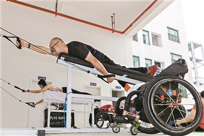 3岁时因小儿麻痹症无法行走,从此与轮椅为伴的张健,近12年来已经参加过90多个马拉松比赛,但使用的都是生活轮椅,而铁三赛的5公里跑中,轮椅运动员需要使用竞速轮椅,且对技术要求很高。竞速轮椅并不是他面临的唯一挑战,去年5月加入铁三队时,他面对的是三大关:没接触过竞速轮椅,没玩过手动自行车,还是个旱鸭子。在许多人看来,他甚至还有“绝对的劣势”——年龄。即使是在健全运动员中,45岁也已经是“高龄”。