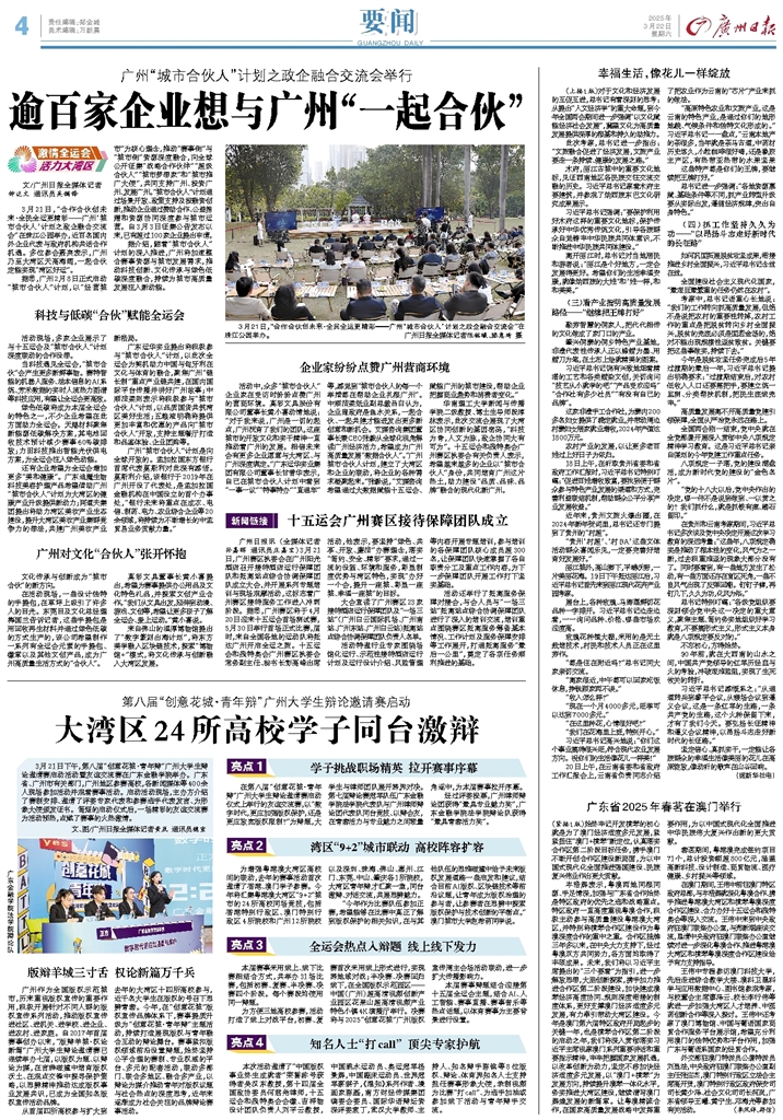 - 逾百家企业想与广州“一起合伙” 激情全运会 活力大湾区 文/广州日报全媒体记者钟达文 通讯员吴镝锋 3月21日,“合作合伙创未来·全民全运更精彩——广州‘城市合伙人’计划之政企融合交流会”在珠江公园举办,近百名国内外企业