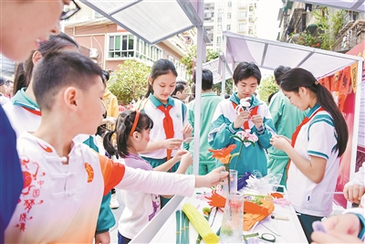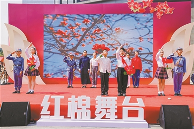 本次活动设置了两大红棉创意集市区。在广东现代广告创意中心广场舞台周围,30个创意集市摊位涵盖了公益服务、手工艺品、文创产品等。在陈复烈士红色文化街区,20个红棉集市摊位组成了热闹的潮墟,以“传统+潮流”碰撞出红色文化新体验。广州市南武中学、绿翠现代实验学校等学校的同学们带来木版年画、手工绒花等传统气息浓厚的手工艺品。