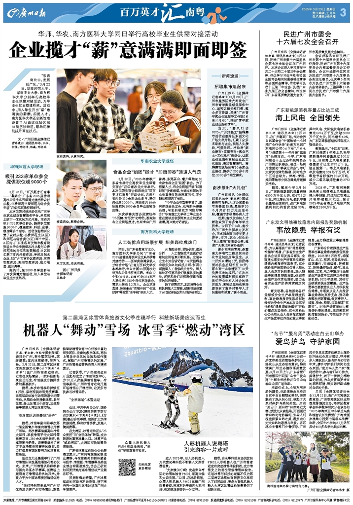 - 企业揽才“薪”意满满即面即签 “东西南北中,发展到广东。”3月22日,华南师范大学、华南农业大学、南方医科大学分别举行高校毕业生供需对接活动,为毕业生就业搭建桥梁。活动中,用人单位开出“薪”意满满的薪酬,招揽人才。南方医科大