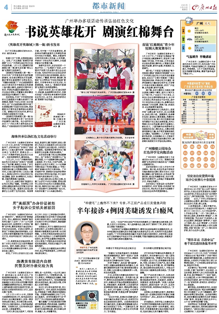 - 书说英雄花开 剧演红棉舞台 《英雄花开英雄城》(第一辑)新书发布 文/广州日报全媒体记者张姝泓、黄岚 通讯员穗宣 阳春三月广州城,红棉绽放盛似火。当前,广州正掀起“英雄花开英雄城”2025广州传承弘扬红色文化系列活
