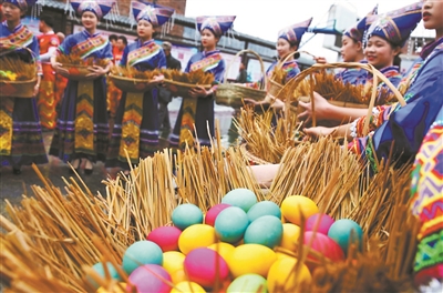 壮族姑娘唱起拦路山歌迎宾客,她们把彩蛋系在脖子上去参加歌墟节,遇到心仪的对象就上去问:“可以碰你的彩蛋吗?”——如果帅小伙喜欢眼前的小妹,就要掏出自己的彩蛋对碰,然后一起吃掉,这样就表示一起种下爱情的种子啦!
