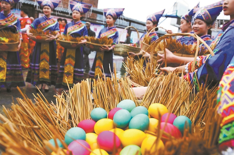 这样有趣的相亲场面,每年三月三这天就会在连山壮族“三月歌墟”上隆重上演,引来众多青年男女手捧装满七彩鸡蛋的网兜来到会场,唱着山歌,找寻意中人,满怀希望在歌舞狂欢中碰出各自的爱情“彩蛋”。