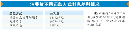 而且不同还款方式,利息差别颇大。目前,消费贷主要还款方式有先息后本、等额本息、等额本金、按月付息按计划还本等。那么,哪种最划算呢?以某行“闪电贷”为例,按贷款20万元、贷款期限36个月、贷款年利率2.58%来算,如果选择按月付息按计划还本,即每月只还利息,第12期和第24期分别偿还10%本金、第36期偿还剩余本金,总利息为14162.7元;如果选择先息后本,即前12期每月偿还利息,后24期每月偿还等额本金及利息,总利息为10774.9元;如果等额本息,总利息为8180元。如此一算,不同还款方式支付的利息差距最高约6000元,相差超70%。
