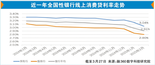 “申请了10多万元的消费贷买了一辆新能源车,每个月大概还款4000元,不仅缓解资金压力,还能早点享受便捷出行。”市民张先生近日发现消费贷利率降低到2.5%左右,马上申请购买了心仪已久的车。近期,多家银行在消费贷领域不断发力,对个人消费贷产品进行提额、延期、降利率,有银行推出的消费贷最高额度达100万元,最长贷款期限延长至7年;消费贷利率更是一降再降,目前已进入了“2时代”,融360数字科技研究院最新数据显示,今年2月,全国性银行线上消费贷平均最低可执行利率为2.91%,同比下降28BP。