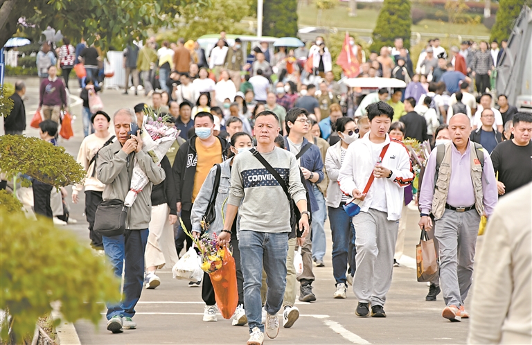 据祥和陵园副主任容肖娟介绍,为保障祭扫工作平稳、有序开展,今年祥和陵园推行实名预约、限时分流制度,并推出异地停车与免费公交接驳服务,昨日调配异地停车位5000个、抽调10台公交运力开行循环免费接驳,确保“停车—等候—接驳”全流程高效运转不拥堵。