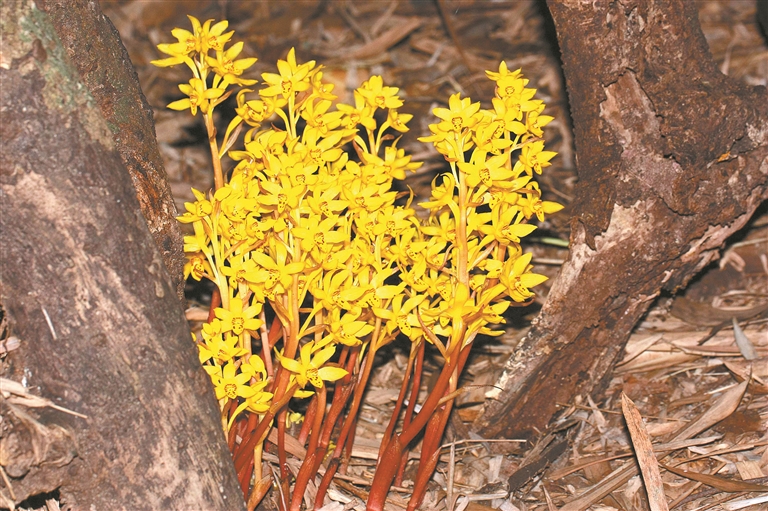 在已发现的丹霞山植物新种中,有丹霞梧桐、丹霞山冬青这样的乔木,有彭华柿、昭璇梨、香花荛花这样的灌木,有丹霞山刚竹、丹霞单枝竹、小麻竹、粤北撑篙竹这样的禾本科竹类,有丹霞兰、广东假野菰这样的与真菌共生植物。