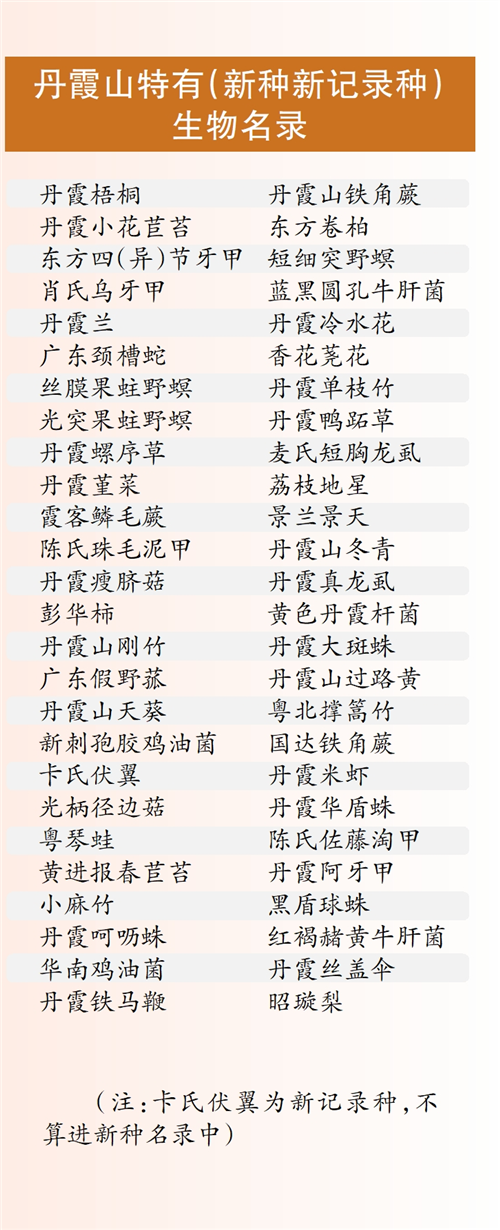 迄今,学者们已经在丹霞山发现丹霞梧桐、丹霞兰、丹霞小花苣苔、丹霞堇菜、广东颈槽蛇、丹霞瘦脐菇、彭华柿、黄进报春苣苔等51个新物种,其中植物新种25个,占据了半壁江山。