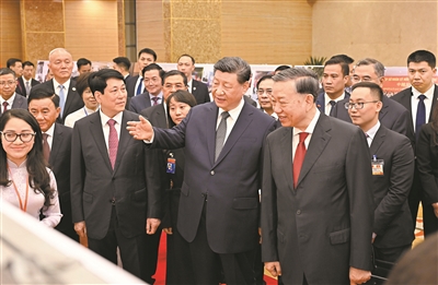活动前,习近平在苏林、梁强陪同下,观看了中越建交75周年图片展,重温中越双方友好交往的珍贵画面。
