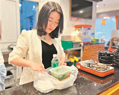 “招牌摆出后,陆续有人前来店里询问。大家都非常有礼貌,小声地向我们确认店里是否真的提供爱心餐,在向我们道谢后打包带走。”让胡蓉印象深刻的一次经历是,4月初的一天,气温骤降,在餐厅即将打烊时,店外来了一位衣裳单薄的阿姨,默默地站在门口看着“免费吃饭”的招牌。胡蓉看出了阿姨可能需要帮助,便立刻让厨师重新开灶炒菜,主动为阿姨送上一份免费的热饭菜,并将随身携带的暖宝宝也送给了她。