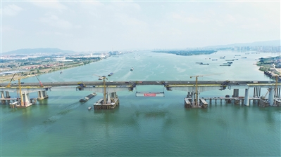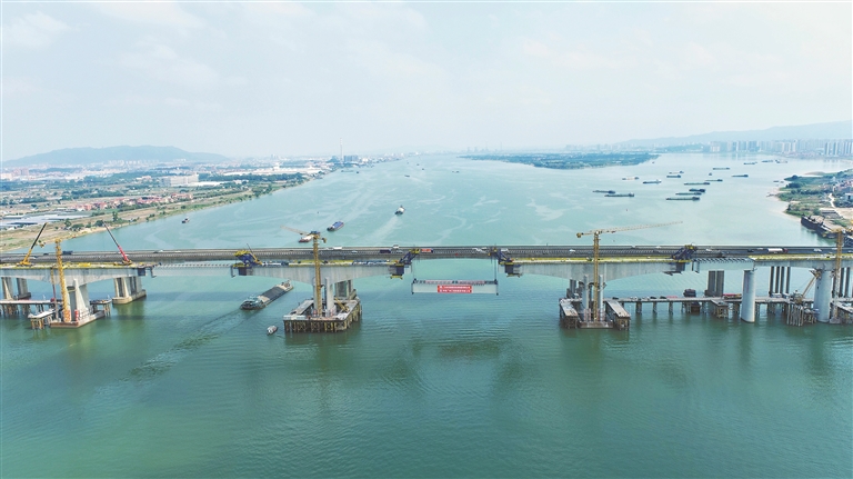 广州日报讯 (全媒体记者李传智 通讯员严晓莹摄影报道)昨日傍晚,广湛高铁佛山特大桥跨西江钢混连续刚构桥迎来历史性合龙时刻。随着重达600吨的合龙段钢梁被缓缓提升至离江面40余米的高空,最后一段钢梁精准嵌入桥体,这座可通行时速350公里高铁的大桥实现全桥合龙。
