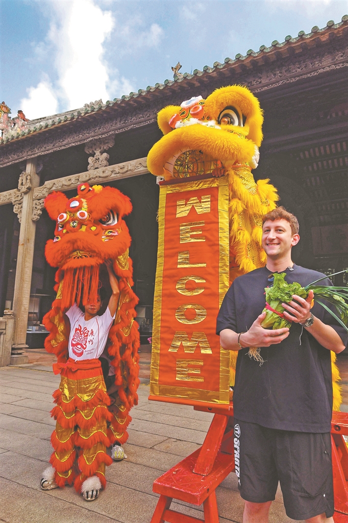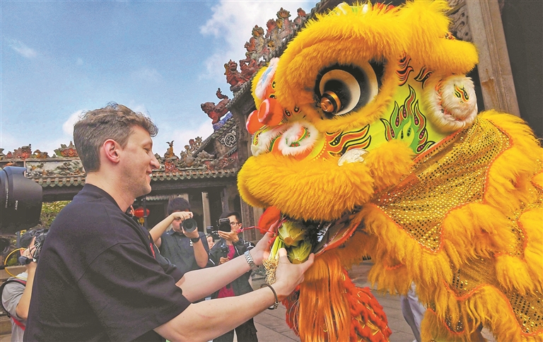 现场,狮舞(广东醒狮)国家级非遗代表性项目传承人赵伟斌及其弟子,为埃文献上一场精彩的传统醒狮表演,灵动威武的舞狮技艺展现了广府民俗的活力。埃文与醒狮趣味互动并上场学习握狮等动作,体验学习了醒狮“喜怒哀乐”等动作要领。舞狮过程中,埃文不小心撞到了头,“做起来比看起来难多了。”体验完毕后,埃文还购买了一只黄色的小狮头礼品带走。