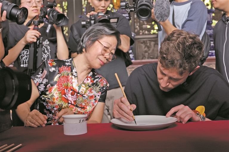 广彩作为岭南非遗又一代表,吸引着埃文的驻足欣赏。历史上,广彩瓷器曾因西洋商人的需求而大量出口,海内外享有盛誉。埃文在国家级非物质文化遗产代表性项目广彩瓷烧制技艺广东省省级代表性传承人何丽芬的指导下,体验图稿设计、描线、涂色等工序,勾勒出广州市花木棉花,近距离感受广州非遗的温度。绘制完广彩作品后,埃文在画作上留下了自己的签名。他签下的是USA+CHINA,埃文用中文说:“中国和美国是朋友。”