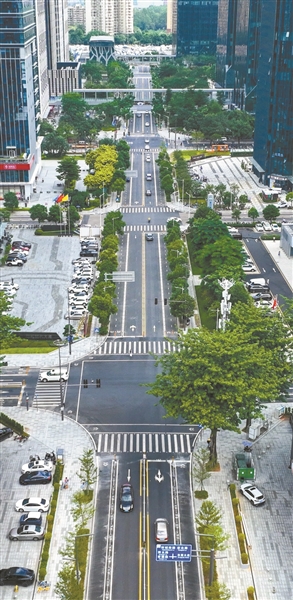 无独有偶,南城总部基地片区道路自启动升级改造以来,景观节点串珠成链。线性公园、带状活力公园、枢纽微花园等功能配套的植入,进一步柔和了办公区的“沉闷”,构建起舒适绿色的交通网络和公共空间,让在此生活、工作的市民有了更多舒适的通勤、交往和休憩空间。