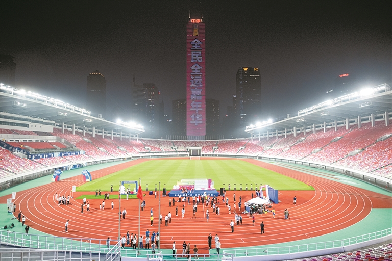 当晚7时整,天河体育中心体育场体育照明启用与亮灯仪式正式开始。随着倒计时的结束,主会场大屏、中信广场幕墙、广州塔及周边商圈大屏同步亮起。这进一步点燃了“全民全运”热情,为广州高水平筹备十五运会和残特奥会营造浓厚氛围。