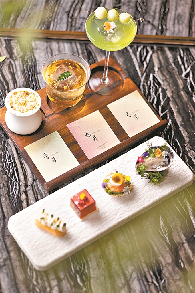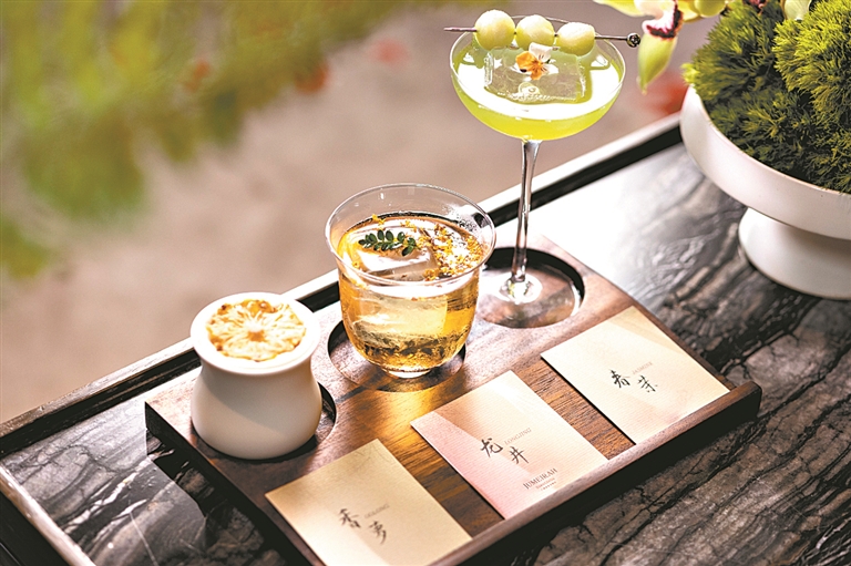 茶点所配之春茶为特调,用茉莉花茶、羊角蜜瓜和苏打水调制而成的“春茉”,清新得很,拂去春日的疲惫;桂花、龙井和清香木凝聚成的“龙井”,桂花如春雨般温柔,香气缭绕。经历8小时冷萃的龙井茶翠绿清新,蕴含春日生机。融化的方冰带来清凉,诉说春日宁静;“香萝”以当季菠萝所带的独特清甜,融合乌龙茶的醇厚和海盐的微咸,清新独特,仿佛春日的阳光,带来自然的馈赠。在大堂酒廊,宾客每日还可品味到新鲜炒制的英德绿茶,这一芽一叶,用古法炒揉,凝萃鲜爽回甘,抿上一口,清澈明亮的汤色,以及淡雅的花香,叫人十分陶醉。