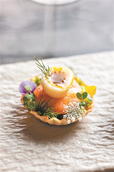 “龙井烟雨”这款点心则将鲜嫩的虾仁浸润在桂花龙井茶的芳香中,虾仁逐渐吸收了龙井的清香,再搭配时令青豆,点缀以鱼子酱,愈加提升了这道佳肴的风味,层层叠叠。