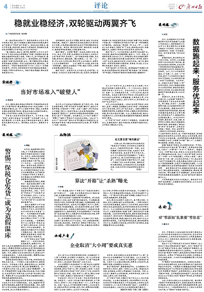 - 稳就业稳经济,双轮驱动两翼齐飞 广州日报评论员 张冬梅 新一波政策组合拳来了!国务院新闻办公室28日举行新闻发布会,重点介绍稳就业稳经济推动高质量发展的若干举措(以下简称“若干举措”)。具体包括支持就业、稳定外贸发展、促进消