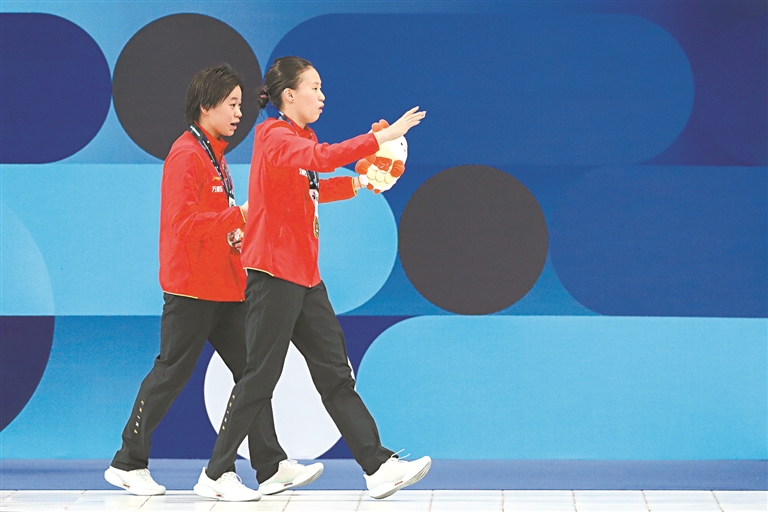 同时,本次世界杯总决赛在运动员出场时增加了专门的展现个性仪式,全红婵就带着队友们在训练之余“搞研发”,她更是亲自示范当前网上火爆的舞蹈“星奇摇”。不过,在昨天的选手亮相时大家没能看到全红婵的“星奇摇”,也许是为了让一起表演的外国选手能快速学会,她把“星奇摇”改成了与外国选手挎着胳膊的“转圈圈”,两人欢乐的场面瞬时引爆网络,网友纷纷感慨“全红婵出场太可爱了”“被全红婵出场动作萌到了”。