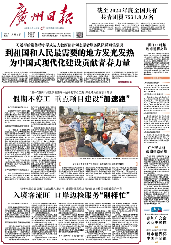 - 假期不停工 重点项目建设“加速跑” 文/广州日报全媒体记者李天研 工地假期“不打烊”,经济大省挑大梁。这个“五一”,广州市重点建设工程的建设者坚守项目一线,紧盯安全、质量、进度,开足马力推进项目建设,全力以赴冲刺节点工期,奋力跑