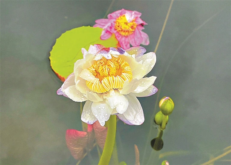 广州日报讯 (全媒体记者肖桂来 通讯员卢晓韵、谢展霖、冯绮华摄影报道)5月9日,广州莲花山景区的莲花仙境出现了一株三蒂莲和一株并蒂同心睡莲,均为景区自主培育。其中“并蒂同心”奇观是在景区40多年莲花培育历程中首次出现的,其自然发生概率不足十万分之一。