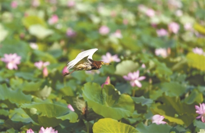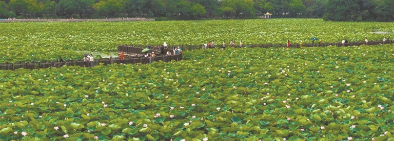 漫步莲湖,只见碧绿的荷叶如伞盖般层层铺展,花叶相依、错落有致,粉白相间的荷花亭亭玉立于水面,或含苞羞涩,或竞相怒放,与蓝天白云、蜿蜒栈道交相辉映,美不胜收。游客们悠然穿行在曲桥、小亭、栈道之间,阵阵清风拂面,荷香扑鼻,仿佛走进了一幅灵动的“曲桥荷韵”画中。