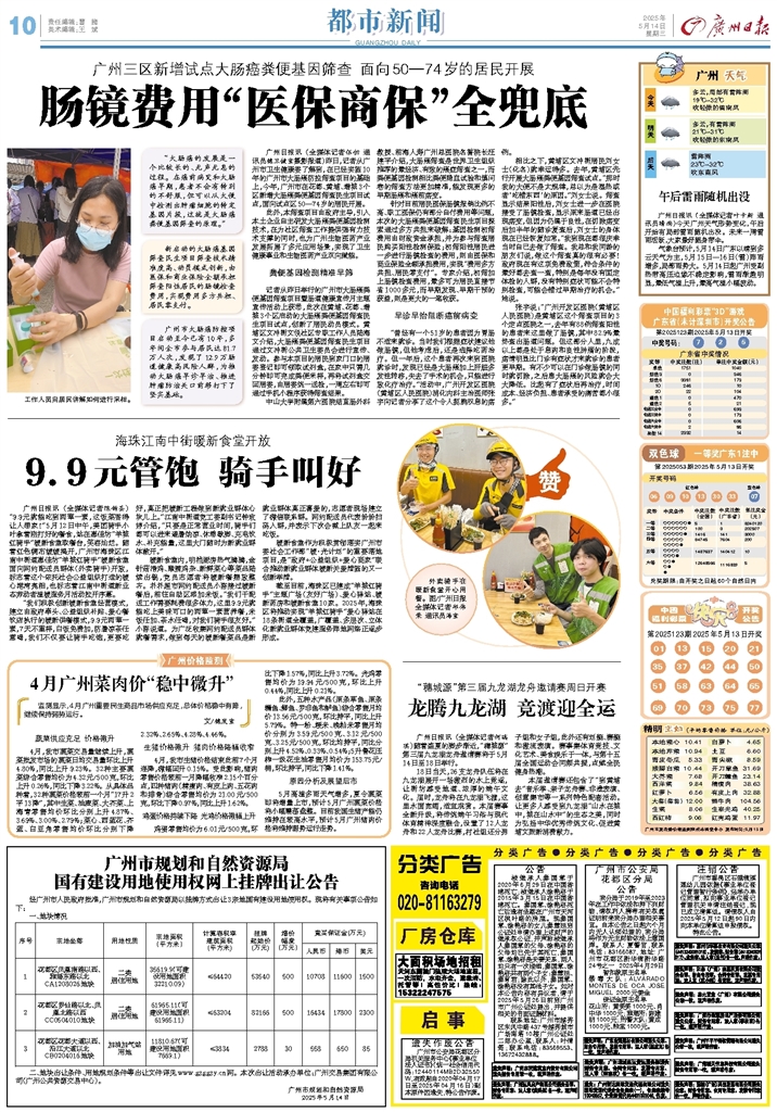 - 肠镜费用“医保商保”全兜底 广州日报讯 (全媒体记者伍仞 通讯员穗卫健宣摄影报道)昨日,记者从广州市卫生健康委了解到,在已经实施10年的广州市大肠癌防控筛查项目的基础上,今年,广州市在花都、黄埔、增城3个区新增大肠癌粪便基因