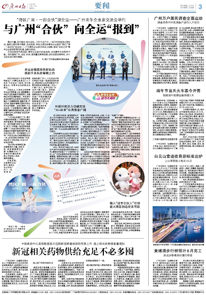 - 与广州“合伙” 向全运“报到” 激情全运会 活力大湾区 青企力量,活力涌动,助力全运。5月16日下午,一场不约而至的大雨过后,越秀公园内草木清新、生机勃勃,来自大湾区的青年企业家在“湾区广阔・一起合伙”迎全运——广州青年
