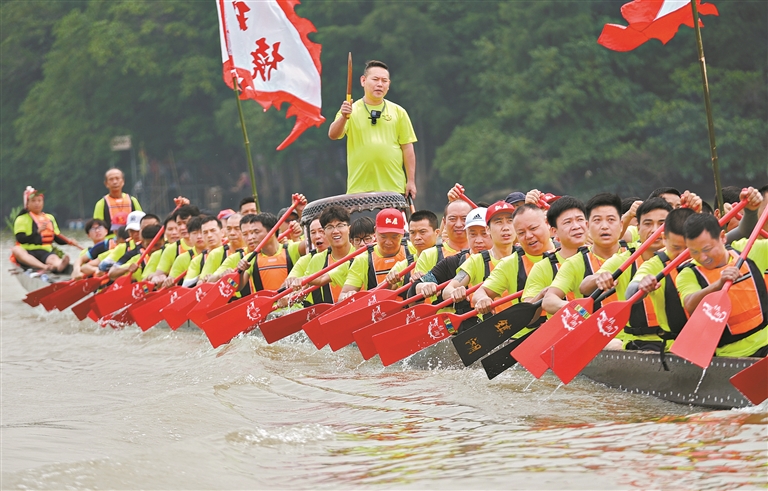广州日报讯 (全媒体记者汤南 通讯员刘珍)昨日,广州市白云区石门街鸦岗村民、龙舟队队员1000多人,分别从陆路、水路出发,前往人和镇蚌湖“走亲戚”,参加“蚌湖景”龙舟自由竞渡。两地乡亲欢喜聚首,再续“双龙出海四龙归”的佳话,蚌湖片区筵开近300桌美味龙船饭,招待鸦岗乡亲及各方嘉宾,致敬“一水相依两地情”。