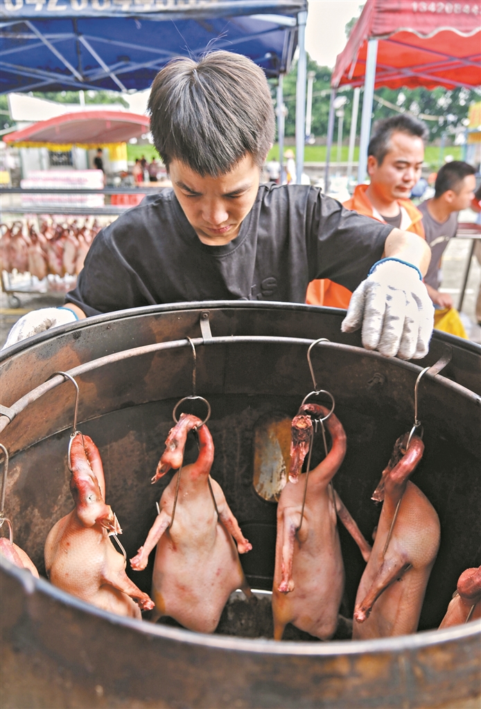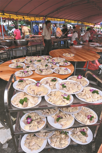 “上菜!”当日,蚌湖保安和华侨会所及蚌湖片区多条村共筵开超过1300桌龙船饭。其中约300桌专门招待鸦岗乡亲、龙舟队队员及各方嘉宾。“红皮赤壮”(脆皮烧肉)“兴高采烈”(辣椒头菜炒花肉)“年年有余”(清蒸多宝鱼)“力争上游”(烧鹅)“展翅高飞”(姜葱白切鸡)……八菜一汤组成天长地久,宾客们大赞“好味”。