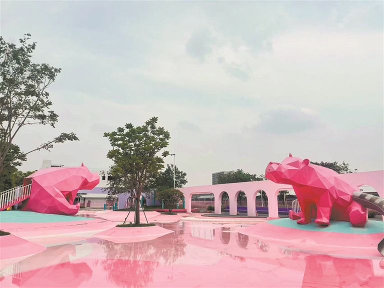 从城市美学出发,这些儿童天地越来越高颜值、智能化、科技感。在南海桂城的二洲奇妙水岸,市民梁小姐带着3岁的儿子前来玩水。这个高颜值的儿童玩水乐园,整体以粉红色系为基调,引入粉色河马IP与无动力玩水设施,营造奇妙梦幻的氛围,一度成为遛娃打卡的热门“网红点”。