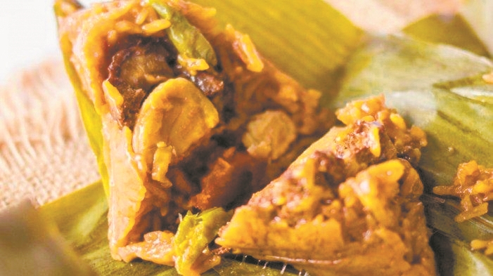 在印度尼西亚棉兰,粽子体现中国和印尼的文化交融,兼具两国风味特色。制作时选用生糯米与多样化馅料,腊肠、虾米、香菇、咸蛋等应有尽有,再加上辣椒点缀,入口香糯而不腻,层次丰富。除了肉粽之外,棉兰还有一种独特的粽子叫作“Kicang”,中文一般称为“碱水粽”。这种粽子完全不含馅料,以糯米为主材,加碱水调和后包裹成形,经过长时间蒸煮后呈现金黄色,油亮而富有弹性,常配以椰浆果酱或印尼特色的棕榈糖浆食用,香甜可口,是当地人喜爱的点心。