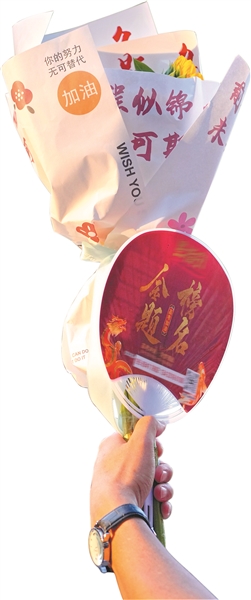 在广州市南武中学,一名考生的爸爸妈妈带着小儿子,拉起横幅迎接走出考场的大儿子,横幅上写着:“儿子!就算你‘考了个寂寞’,爸妈都相信你前途无量。”在铁一中学,家长曾女士给孩子准备了“荔枝花”。她说,荔枝有非常好的“意头”,孩子能坚持下来,就是成功。