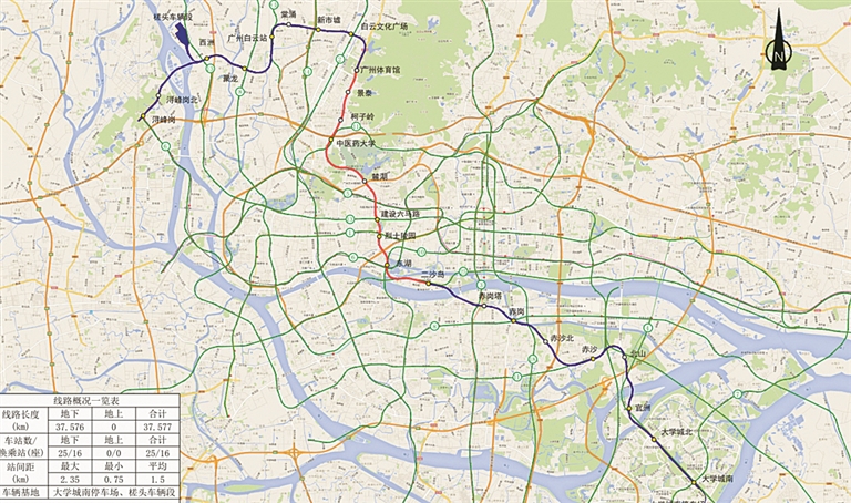 广州地铁宣传部工作人员张洁介绍,十二号线北起浔峰岗,南至大学城南,呈西北—东南走向,全线共设车站25座,能将南部四号线和西部金沙洲客流快速引入中心区,对于提高轨道交通线网服务水平具有重要意义。十二号线东、西段将分段运营,其中东段(二沙岛—大学城南)线路长15公里、设9座车站,西段(浔峰岗—广州体育馆)线路长12.9公里,设9座车站,十二号线中段(景泰—东湖)及赤岗站今年不同步开通。