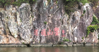 浈阳峡之雄峻奇险,令历代文人墨客为之倾倒,张九龄、杨万里、袁枚等大家都曾在此留下华章。而东岸古栈道之上 “凿山通道”四个醒目的楷体阴刻大字,更是见证了古人不畏艰险、开辟通道的 “愚公精神”。这四个字刻在江岸八丈石下游约30米处的石壁上,分别为横行和竖行两种;横书的“凿”字较大,有1.76平方米,其余三字为1.3平方米;竖书分两行,字较小,每字为0.4平方米,无落款;“凿山通道”下另有“黄金万两”四字,已被水浸,每个字有0.03平方米。从字意考究,与修栈道有关,表现开路艰辛。专家考证后认为,从风化程度判断,可能出自宋代工匠之手,它不仅是古代交通建设的印记,更是荔枝能够顺利北上的重要保障。
