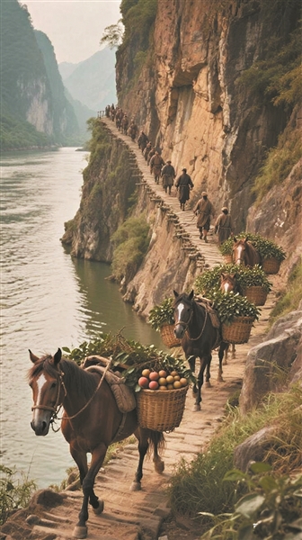 专家考证,古代岭南荔枝进贡,需从广州出发,经清远、英德,再北上乳源县,途经梅花、坪石、武阳司等地,最终进入骑田岭道。而浈阳峡的古栈道,极有可能就是这条荔枝北上进贡通道的关键段落。试想千年前,荔枝成熟时节,装满荔枝的船只沿北江驶来,行至浈阳峡时,因水势凶险,需将荔枝卸下,通过古栈道转运。栈道上,挑夫们脚步匆匆,小心翼翼地护着荔枝,生怕磕损了这些要进贡皇室的珍品。古栈道绝壁之上,古人“凿山通道”的崖刻依稀可见。