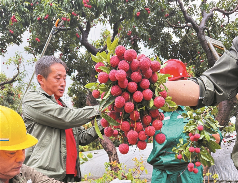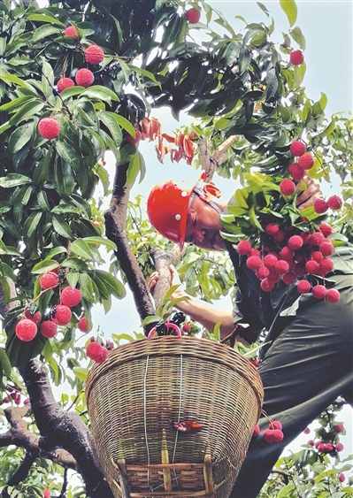 一串串饱满鲜红的荔枝沉甸甸地挂满枝头。树上,工作人员小心翼翼地攀爬摘荔枝;树下,一筐筐诱人的果实被细心打包运往餐厅——深大师生早已排队等待,翘首以盼。
