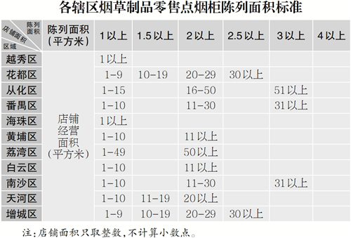 第十条 结合各辖区实际情况,烟草制品零售点经营场所应设置烟柜作为陈列面积,卷烟陈列面积要求如下: