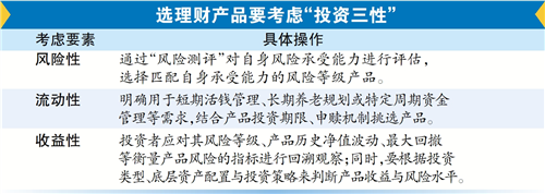 普益标准研究员刘思佳介绍说,首先,投资者应通过“风险测评”对自身风险承受能力进行评估,选择匹配自身承受能力的风险等级产品;其次,明确用于短期活钱管理、长期养老规划或特定周期资金管理等需求,结合产品投资期限、申赎机制挑选产品。