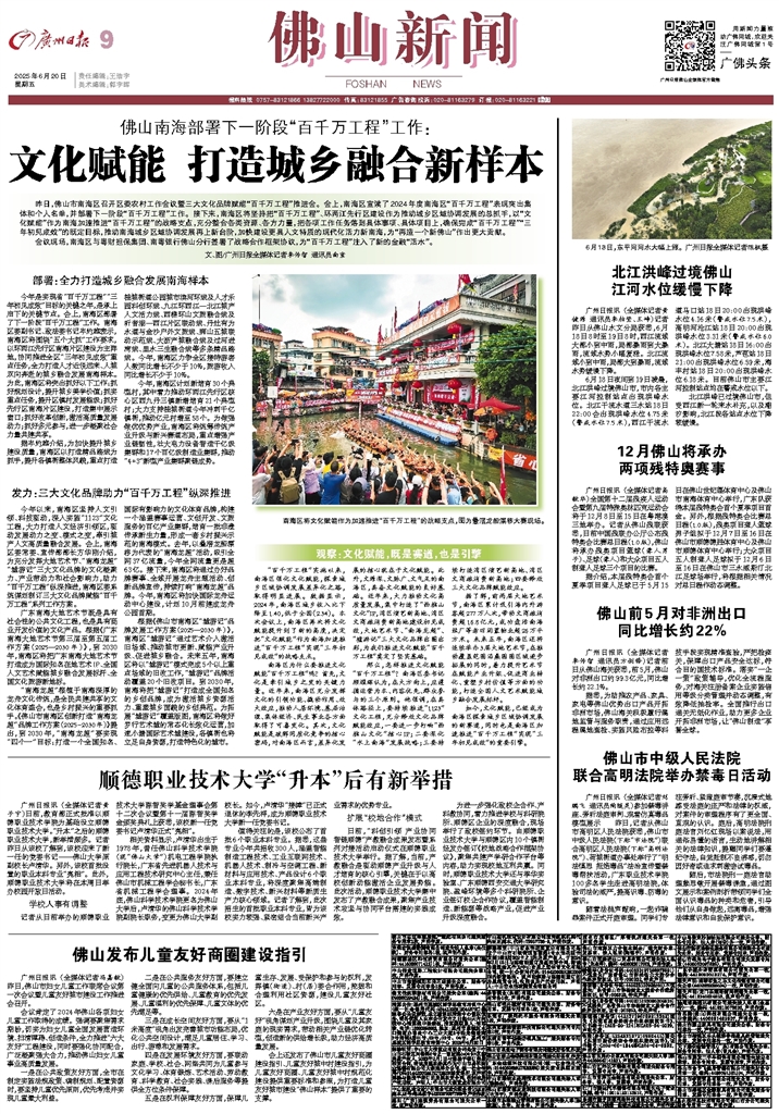 - 文化赋能 打造城乡融合新样本 昨日,佛山市南海区召开区委农村工作会议暨三大文化品牌赋能“百千万工程”推进会。会上,南海区宣读了2024年度南海区“百千万工程”表现突出集体和个人名单,并部署下一阶段“百千万工程”工作。接下来,南
