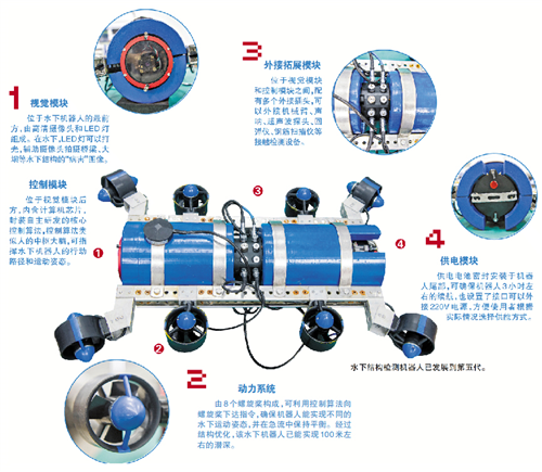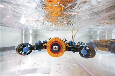 由8个螺旋桨构成,可利用控制算法向螺旋桨下达指令,确保机器人能实现不同的水下运动姿态,并在急流中保持平衡。经过结构优化,该水下机器人已能实现100米左右的潜深。
